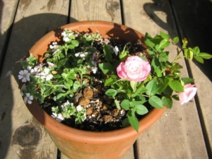 さっそくカスミソウと寄せ植えし、ついている花をカットして様子を見ることに…